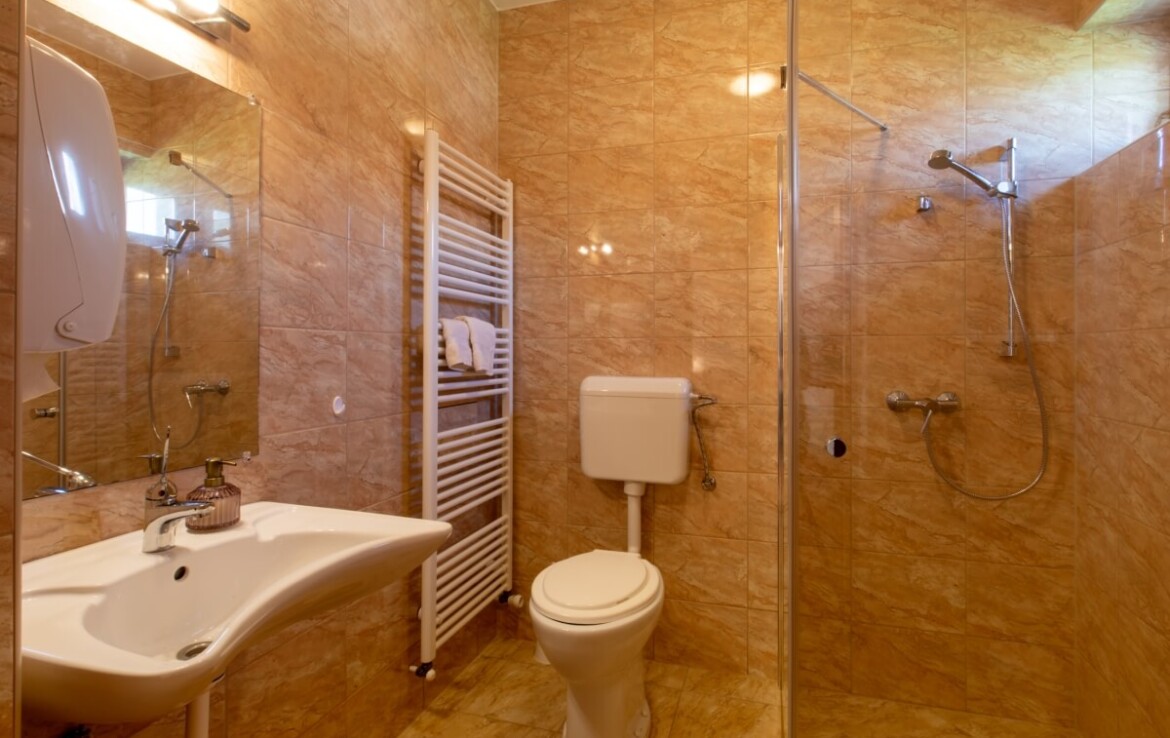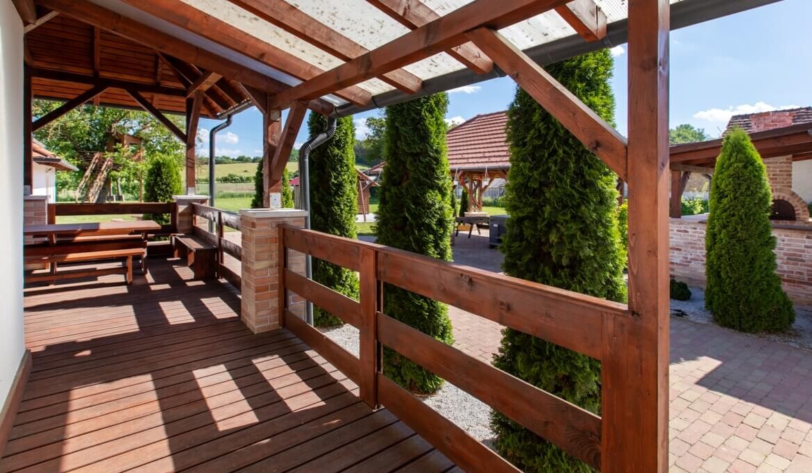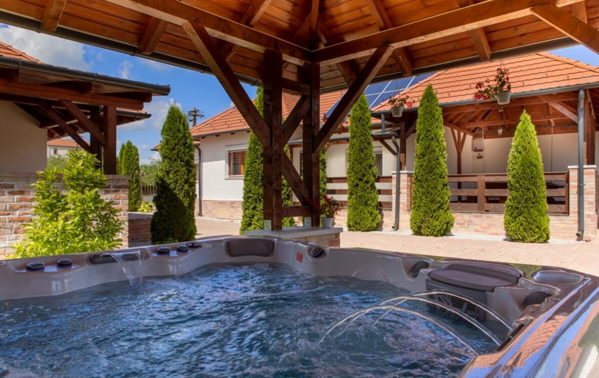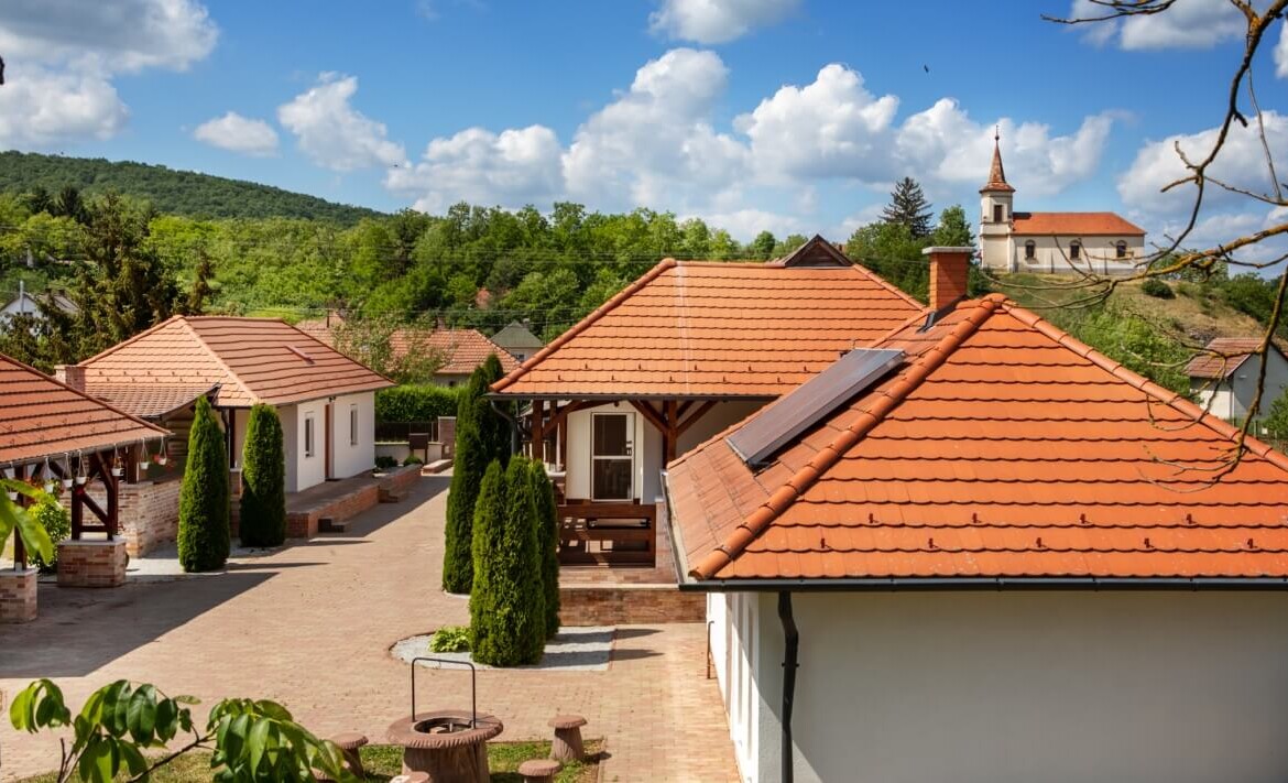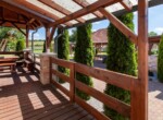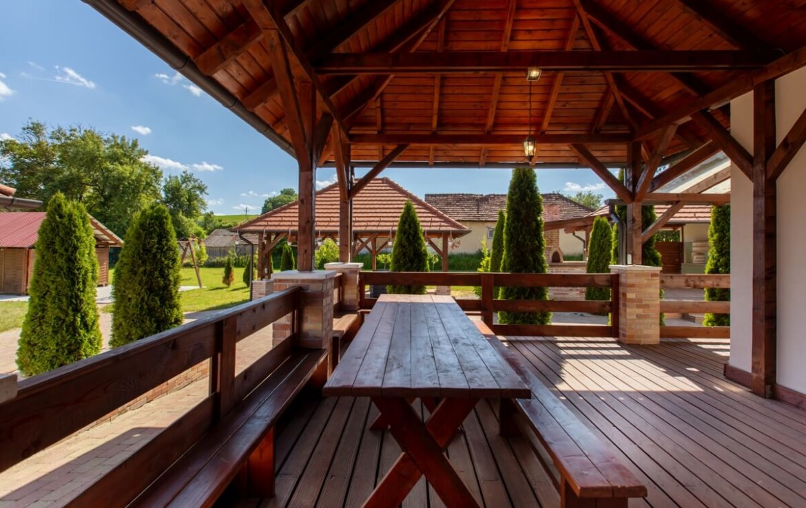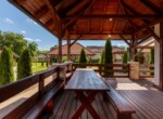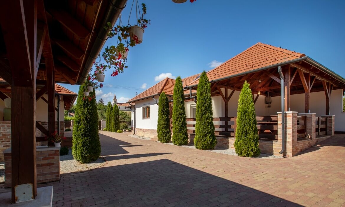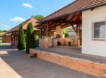 ✔ Hlavný dom (cca 71 m²) – kuchyňa s jedálňou (kompletne zariadená), dve veľké izby (25m2 a 20m2), každá s vlastnou kúpeľňou s WC + veľká prekrytá terasa s duchom typickej maďarskej vidieckej architektúry s dreveným sedením aj pre 12 ľudí.