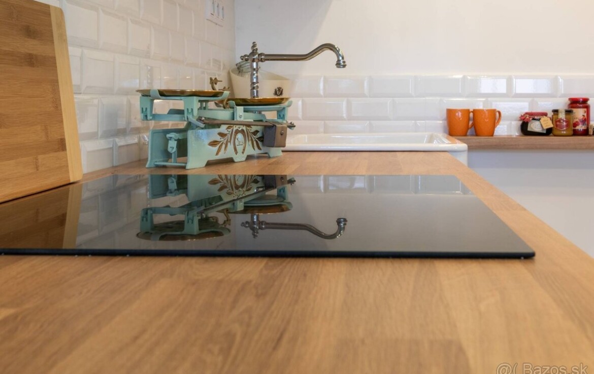 Apartmán č.1: priestranná obývačka s 65″ SMART TV a soundbarom, jedálenský stôl pre 8 osôb, kvalitne vybavená kuchyňa (umývačka, kávovar DeLonghi, liatinové hrnce…), kúpeľňa, WC, spálňa s manželskou a rozťahovacou posteľou.